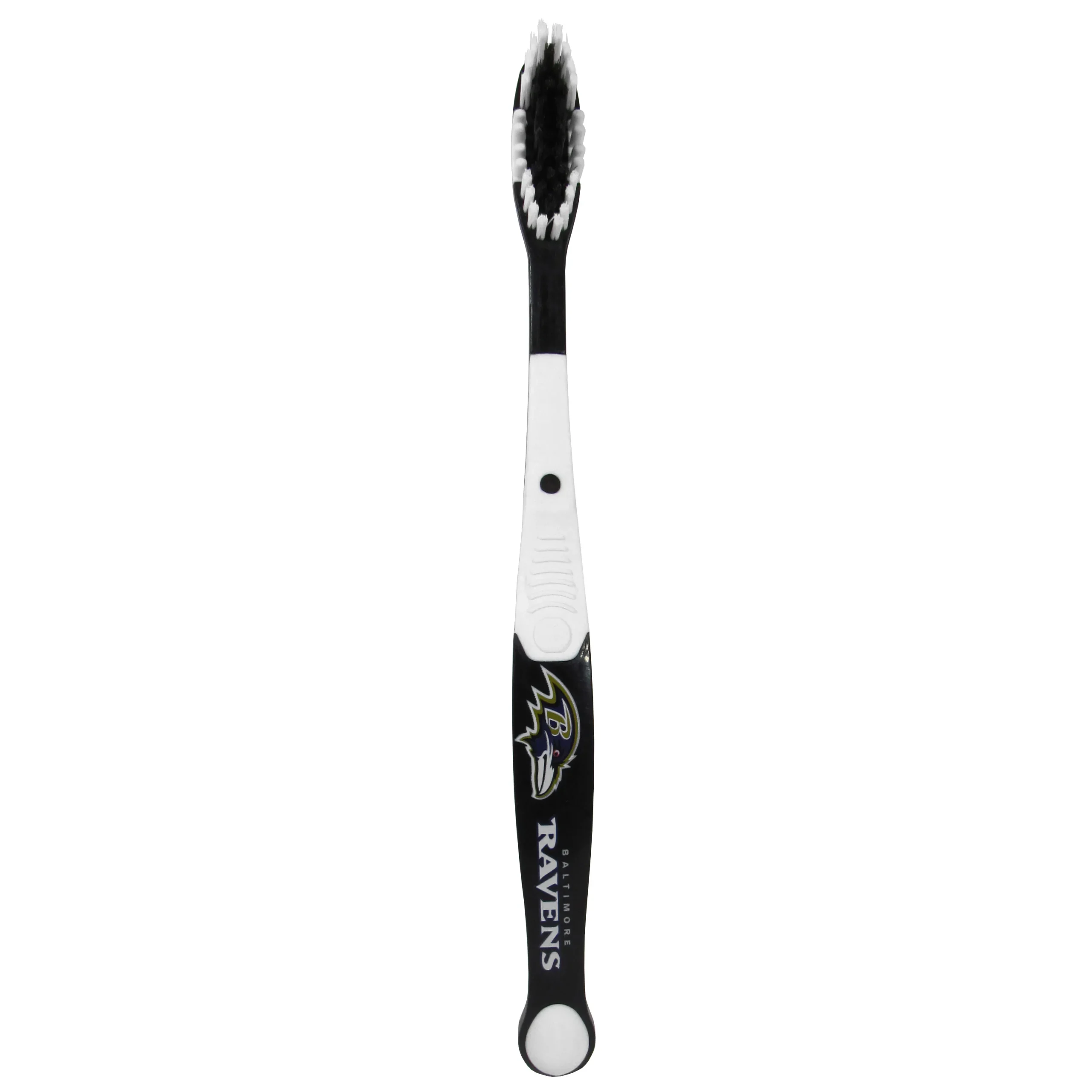 Why have a boring old toothbrush when you can have the MVP of toothbrushes! This cool Baltimore Ravens toothbrush features crisp team graphics on a team colored toothbrush. This is no simple novelty item though, it is a high-quality hygiene device with soft bristles for a gentle clean and rubber gum massagers on the sides of the bristles.