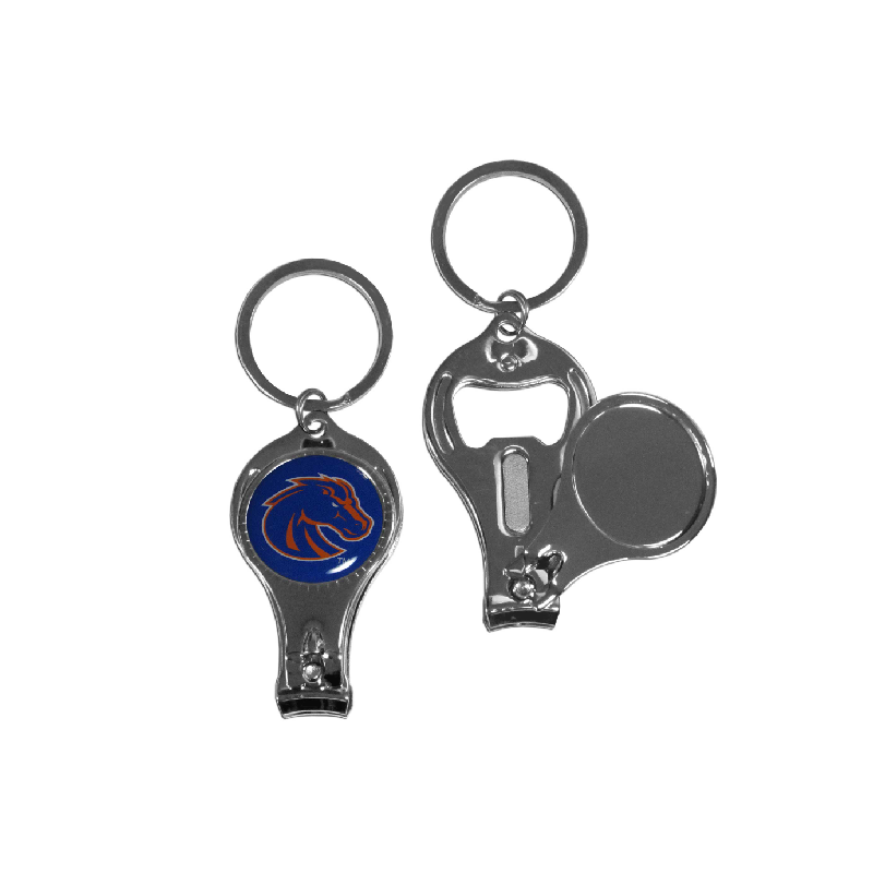 This unique Boise St. Broncos key chain has 3 great functions! The key chain opens to become a nail clipper, when open you can access the nail file pad and the key chain has a bottle opener.