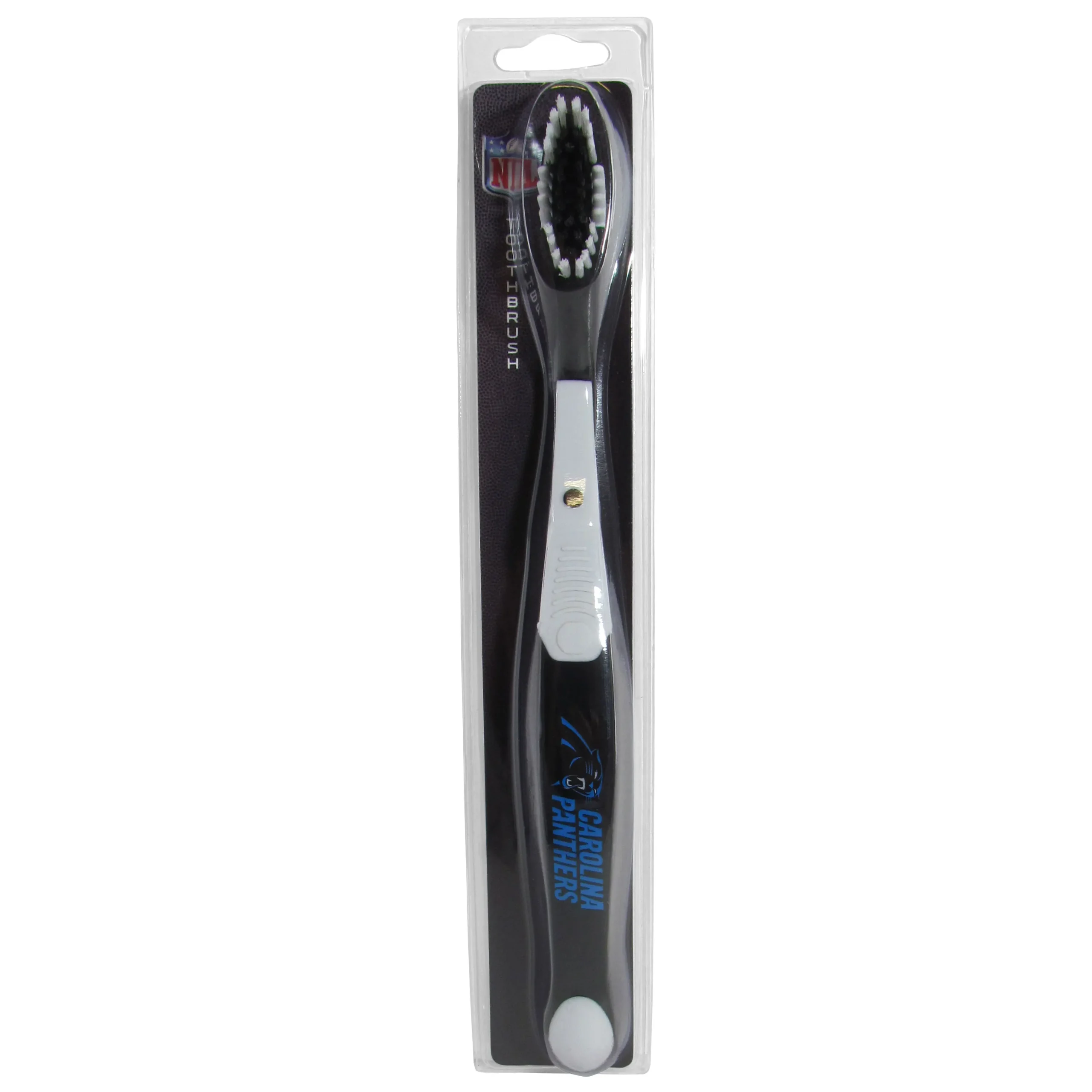 Why have a boring old toothbrush when you can have the MVP of toothbrushes! This cool Carolina Panthers toothbrush features crisp team graphics on a team colored toothbrush. This is no simple novelty item though, it is a high-quality hygiene device with soft bristles for a gentle clean and rubber gum massagers on the sides of the bristles.