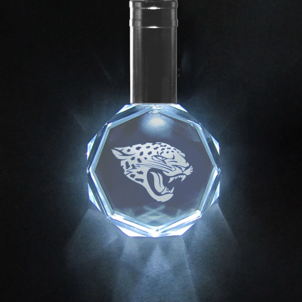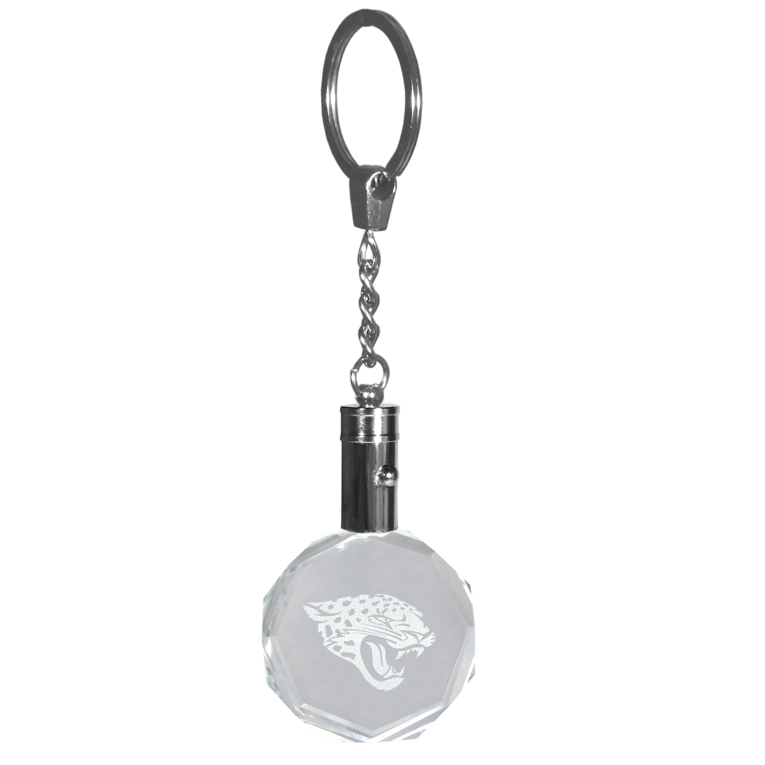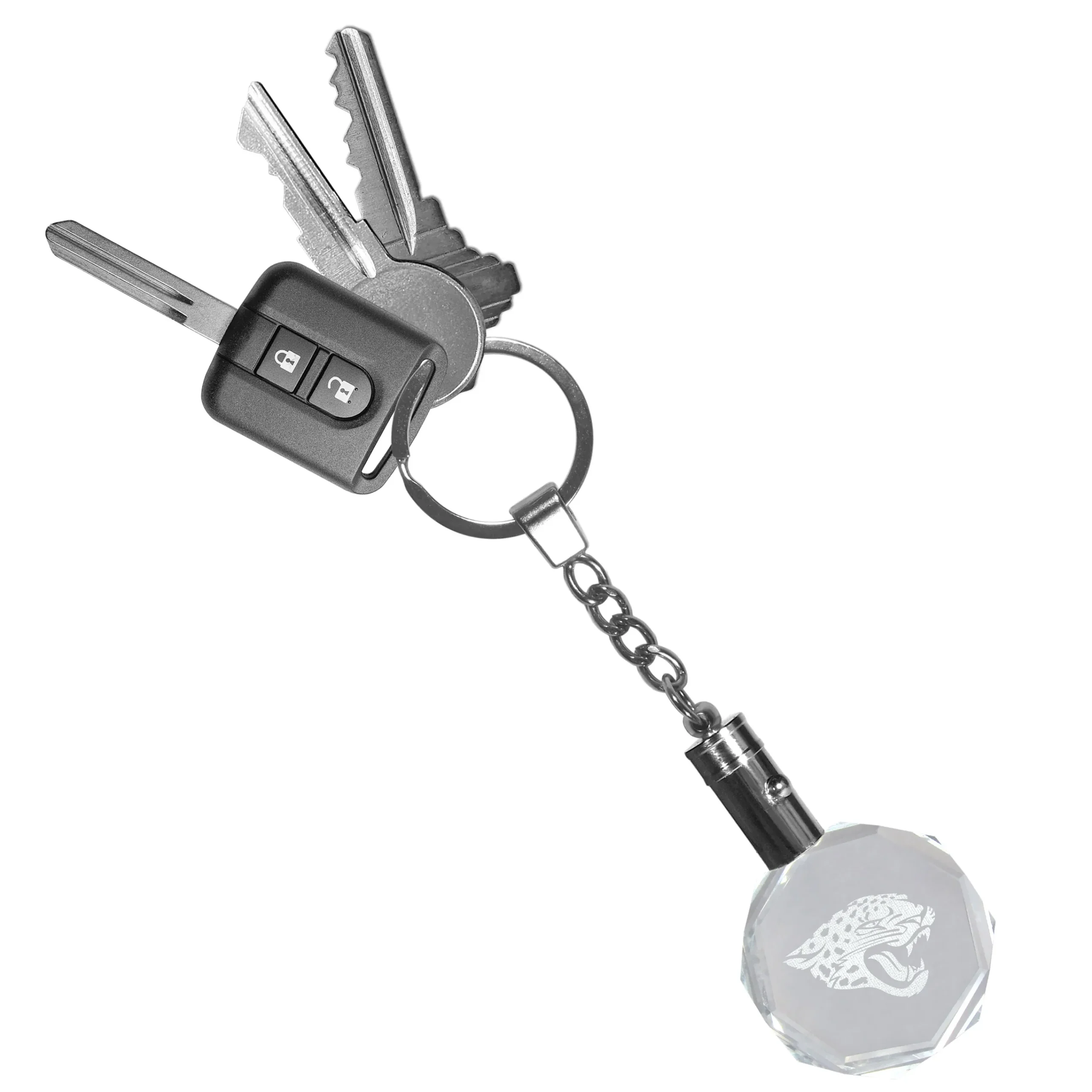 This beautiful crystal key chain has a laser etched Jacksonville Jaguars logo in the center that is eye-catching on it’s own but this has the added benefit of light! Push the button on the side and the entire beveled crystal fob lights up showing off the logo is great detail.