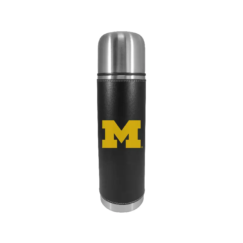 This attractive, 26 ounce Michigan Wolverines thermos is a great way to keep your beverages hot while on the go. The 11 inch tall, vacuum sealed thermos features a black vinyl wrap with stitched details and a digitally printed team logo. The lid screws on and can be used as a cup.