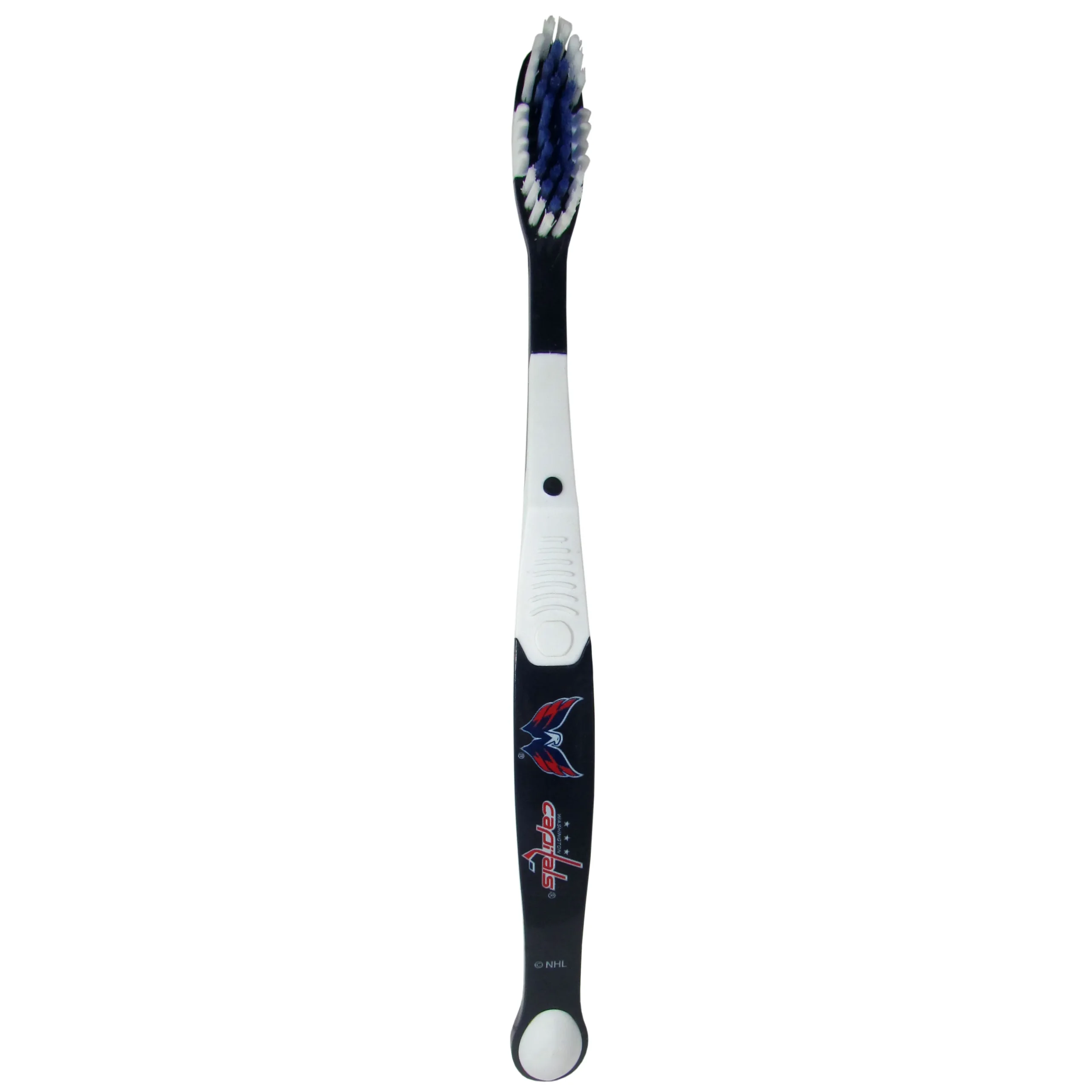 Why have a boring old toothbrush when you can have the MVP of toothbrushes! This cool Washington Capitals® toothbrush features crisp team graphics on a team colored toothbrush. This is no simple novelty item though, it is a high-quality hygiene device with soft bristles for a gentle clean and rubber gum massagers on the sides of the bristles.