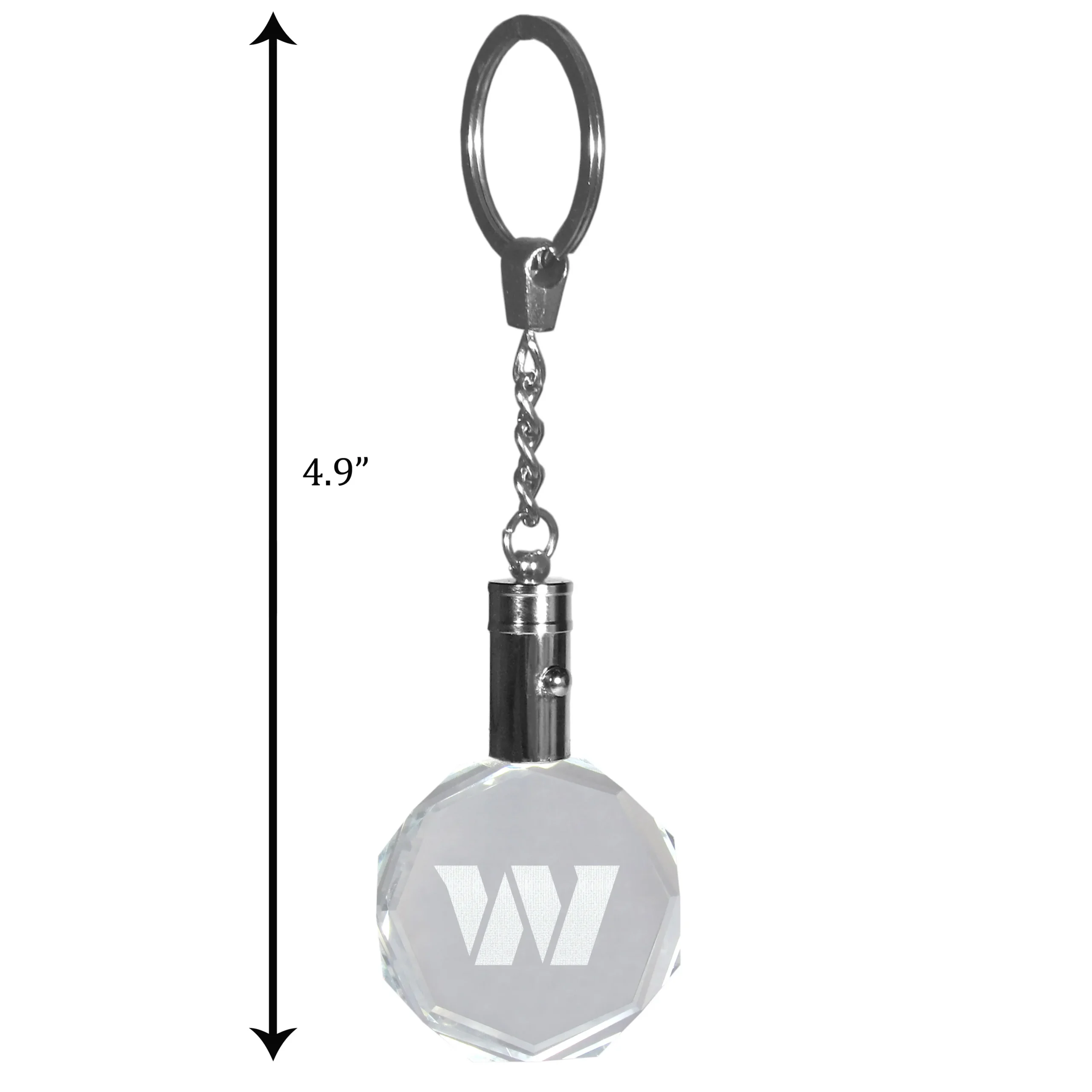 This beautiful crystal key chain has a laser etched Washington Commanders logo in the center that is eye-catching on it’s own but this has the added benefit of light! Push the button on the side and the entire beveled crystal fob lights up showing off the logo is great detail.